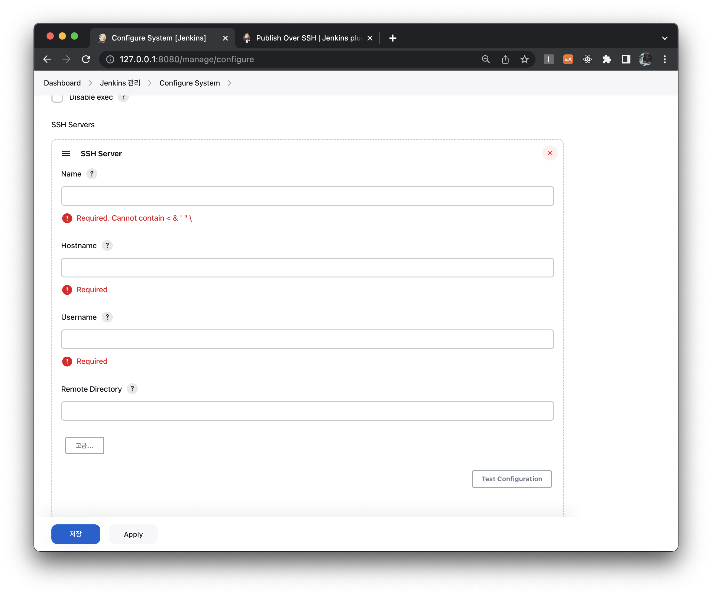 플로그인 설치가 완료되었다면, Jenkins 관리 > 시스템 설정 으로 들어가서 Publish over SSH 로 이동합니다.