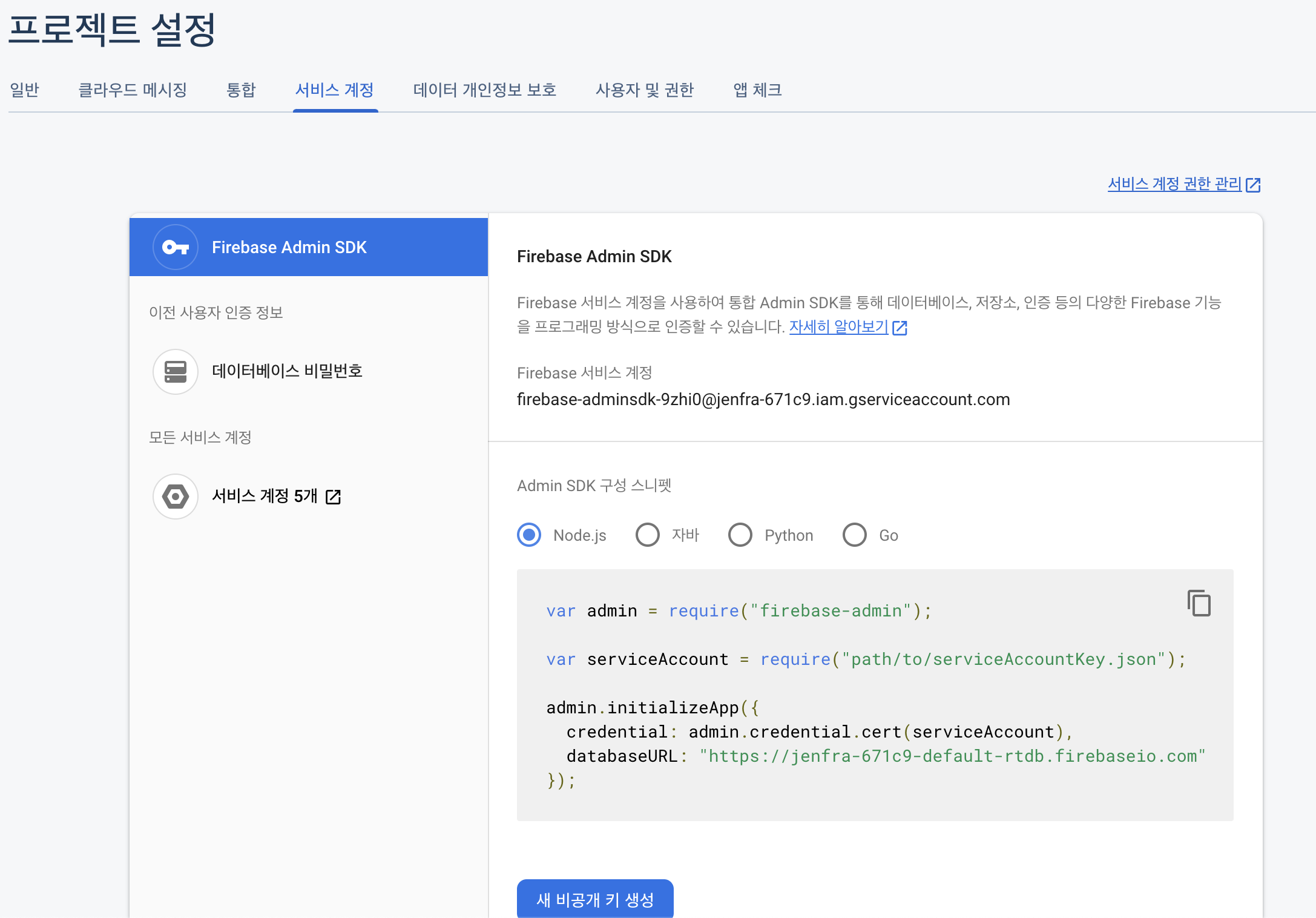 5) 서비스 계정 에서 새 비공개 키 생성 을 클릭하여 키를 생성합니다. 생성한 키 파일의 경로를 잘 알 수 있도록 폴더를 생성하여 저장해둡니다. 아래 나와있는 코드는 config.json 파일에 작성해야 할 코드입니다.